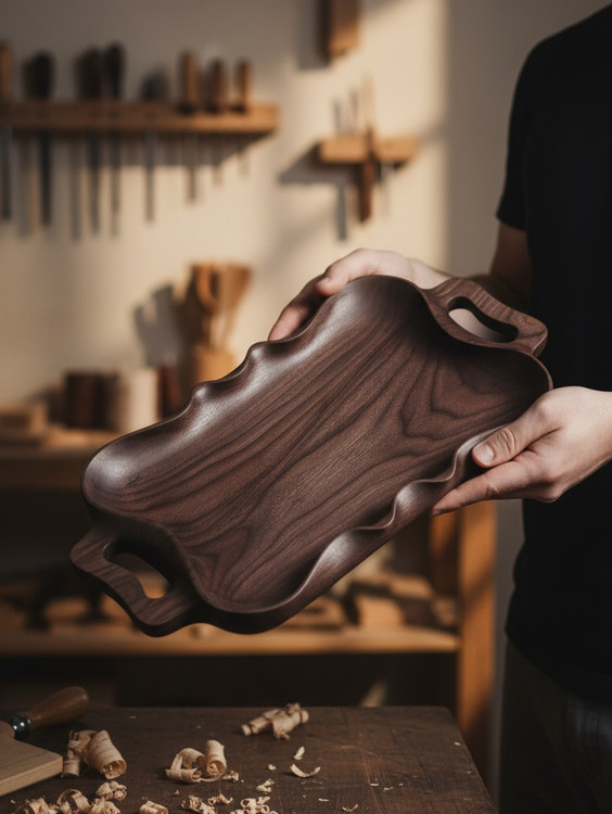 سینی پذیرایی مدل خزر کاملا دست تراش و یک تکه از چوب گردو ساخته شده و با روغن گیاهی مخصوص ظروف چوبی پوشش داده میشود .